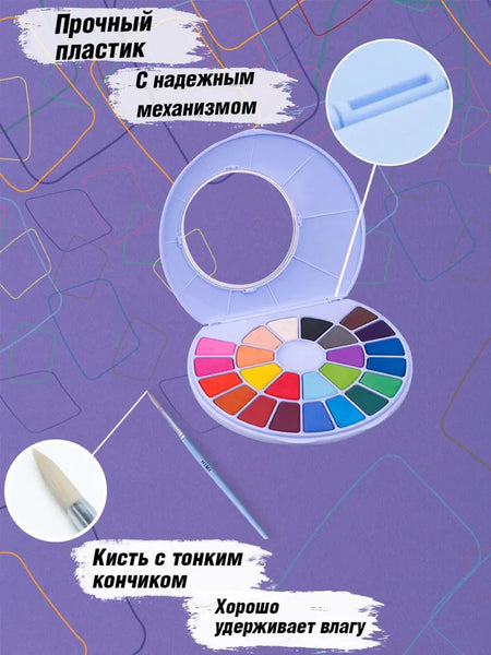 Акварель высокопигментированная, отлично смешивается, замечательно наносится и великолепно ведёт себя на бумаге, а тщательно подобранная цветовая гамма позволит изобразить всё, что захочется!) Краски изготавливаются методом запекания и последующего разрезания брусочков, поэтому они одинакового размера, надежно закреплены в ячейках. Поверьте, этого набора вам хватит надолго, потому что расход краски очень экономный – акварель легко набирается на кисть, а насыщенность можно регулировать добавлением воды.