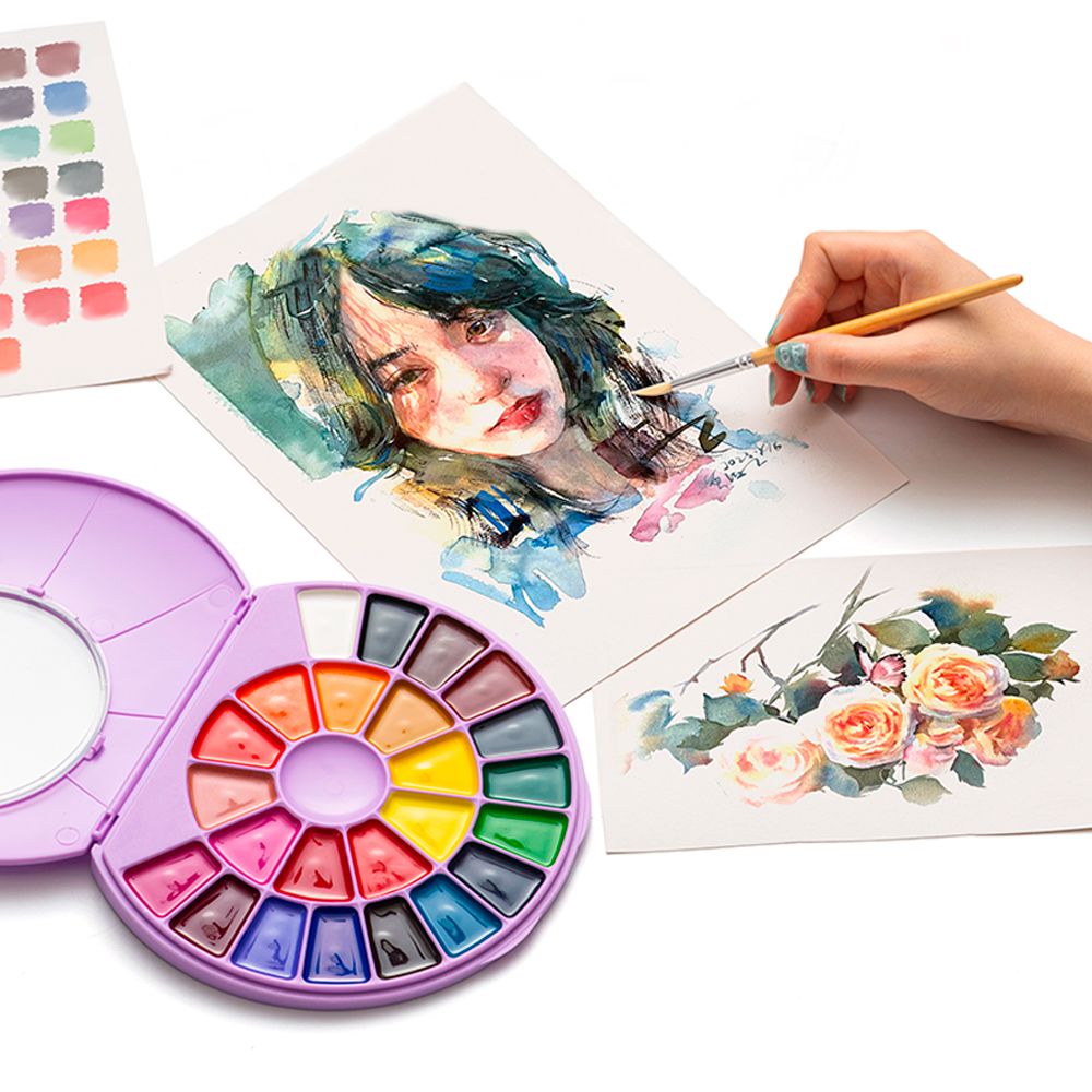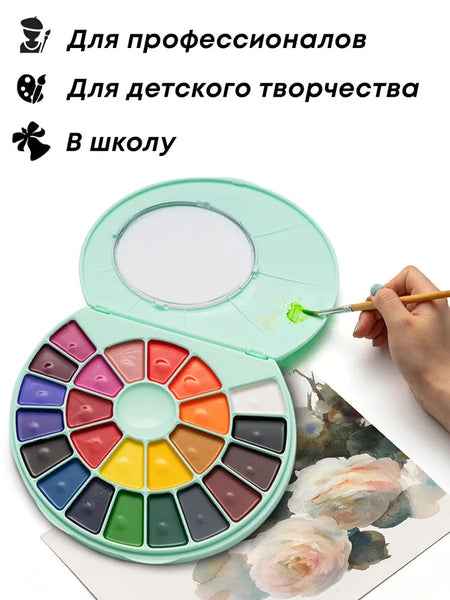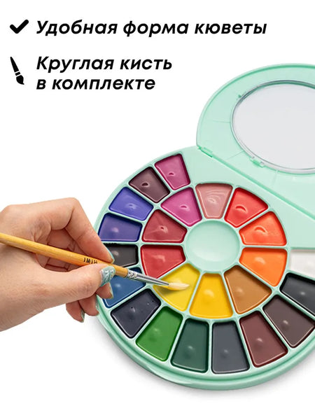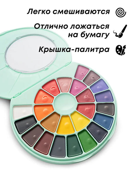 Акварель высокопигментированная, отлично смешивается, замечательно наносится и великолепно ведёт себя на бумаге, а тщательно подобранная цветовая гамма позволит изобразить всё, что захочется!) Краски заливаются непосредственно в кейсы. Поверьте, этого набора вам хватит надолго, потому что расход краски очень экономный – акварель легко набирается на кисть, а насыщенность можно регулировать добавлением воды.