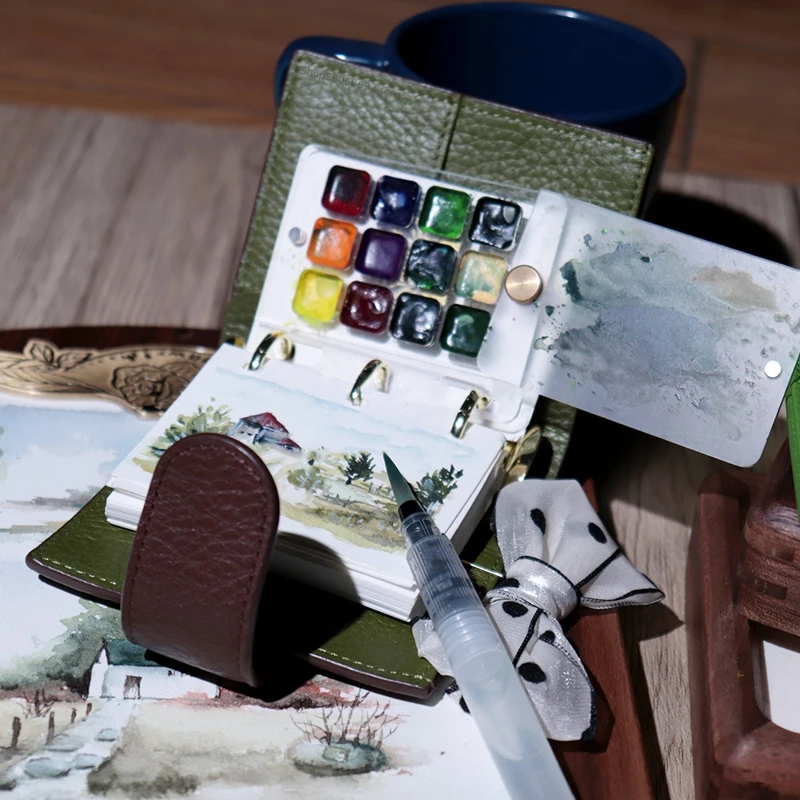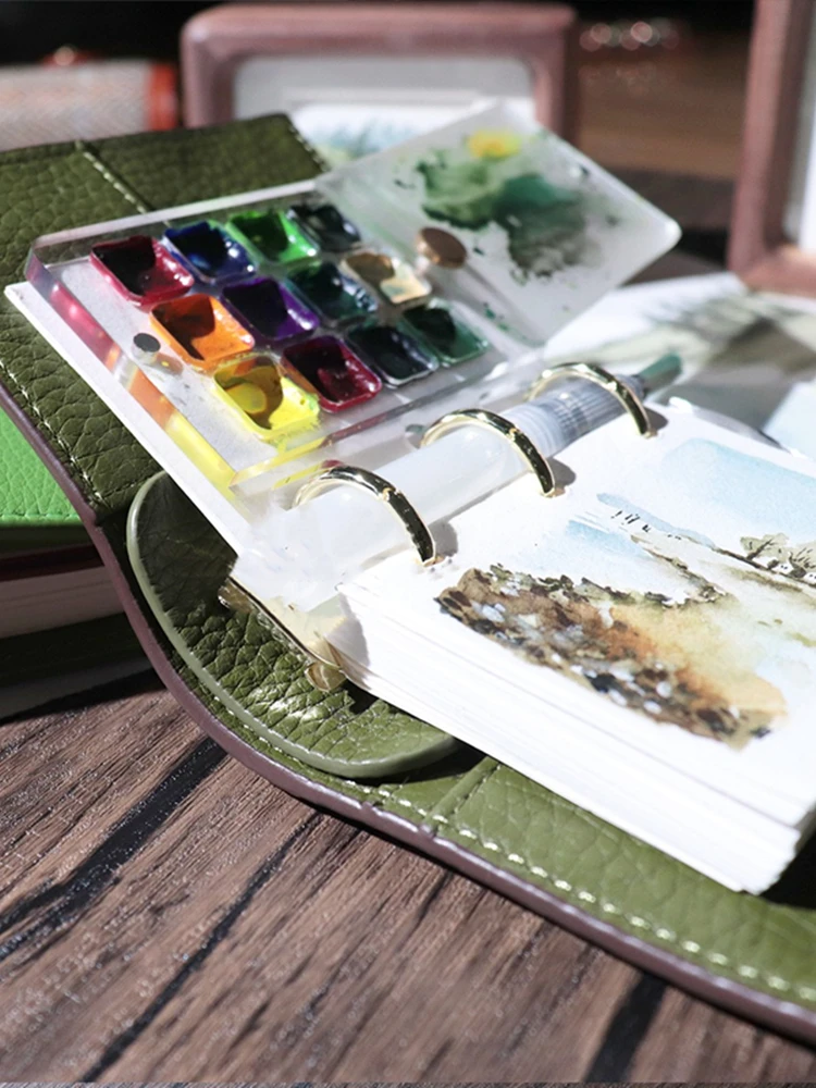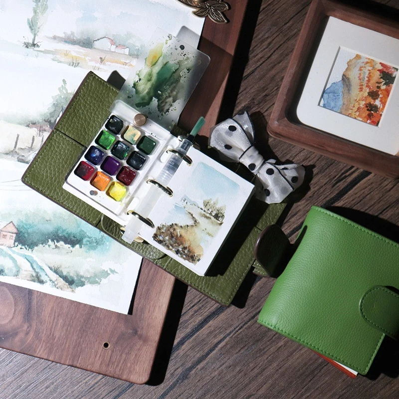 Product name: A9 top layer leather hand Number of inner pages: less than 100 pages Surface material: cowhide Inner page material: Dowling paper Product introduction: The A9 mini three-hole handbook book brought this time is to meet the needs of watercolor handbooks. It can be paired with store-sold water storage brushes. Especially suitable for watercolor style paintings. The manual is made of real first layer cowhide, semi-manual and semi-machined. If you want to buy a small palette, you can click the link below to buy: https://www.aliexpress.com/item/1005004170909727.htmlnk below to buy The book is available in two colors and can be divided into: Bright green inside and out, the leather is soft and the surface texture is smaller and more uniform. super soft, the outer skin is brown, the surface texture is large, there may be uneven growth lines, people who are more concerned about the texture are not recommended to choose this product, the inner skin is light green lychee grain, the texture is larger and more uniform