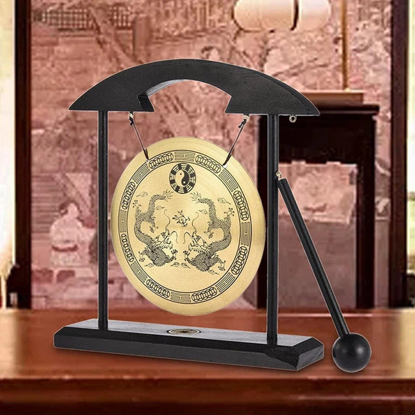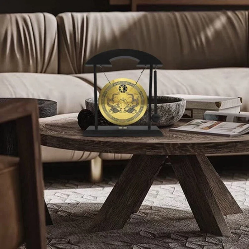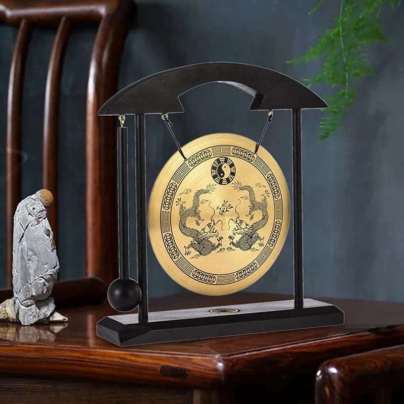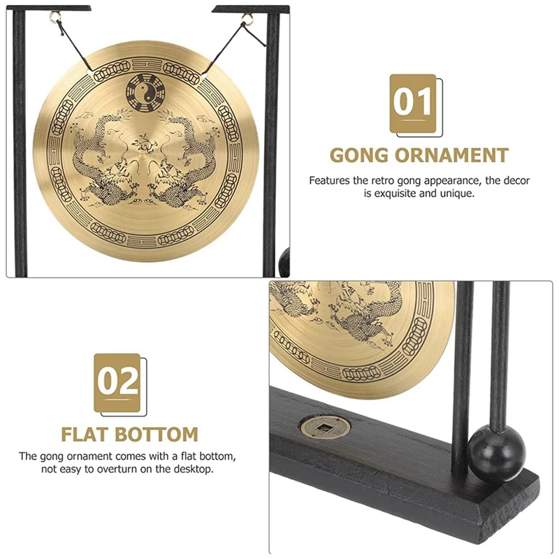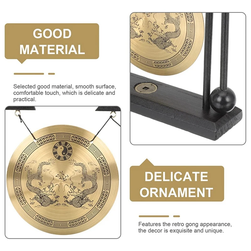 Desktop Gong - Feng Shui Brass Gong Desktop Ornament With Stand And Mallet, Delicate Chinese Home Decor Durable Double Dragon