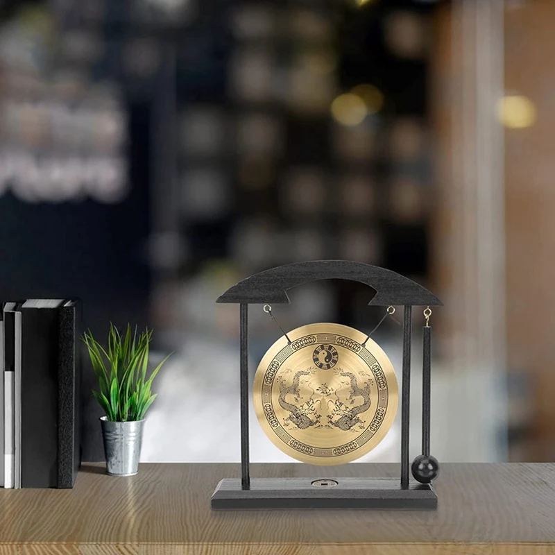 [EXQUISITE DESIGN]: The feng shui brass gong desktop adopts a unique Chinese style design, a small brass gong, which is exquisite and fashionable, a copper coin is inlaid in the center of the bottom of the wooden frame, and a hook and loop is designed on the right side of the top, which is convenient for hanging the drum hammer.