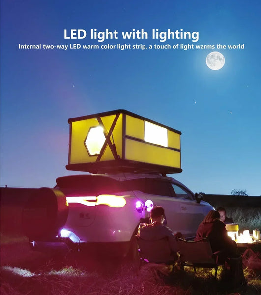 Foldable, Electric Auto Opening/Closing and Pop Up Design: patented side whole boards folding technology, this electric car tent roof top can be opened or closed automatically by a remote controller,Use the top tent to sleep 3-4 people for camping, or as a dressing room, or as a place to store your gear.