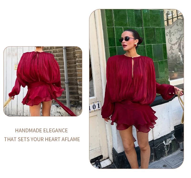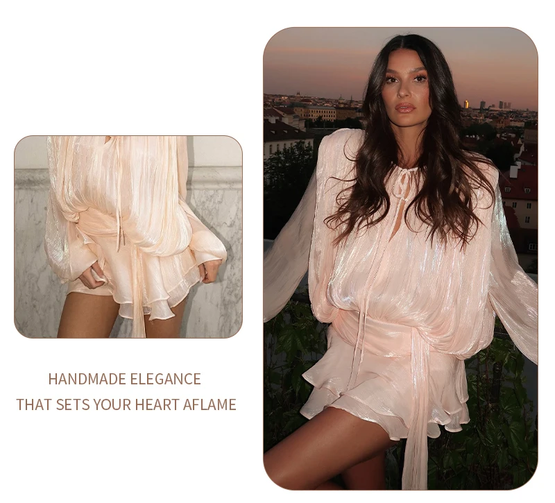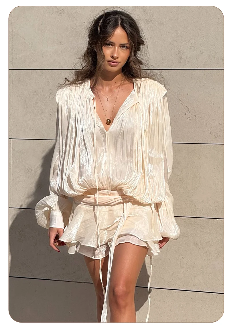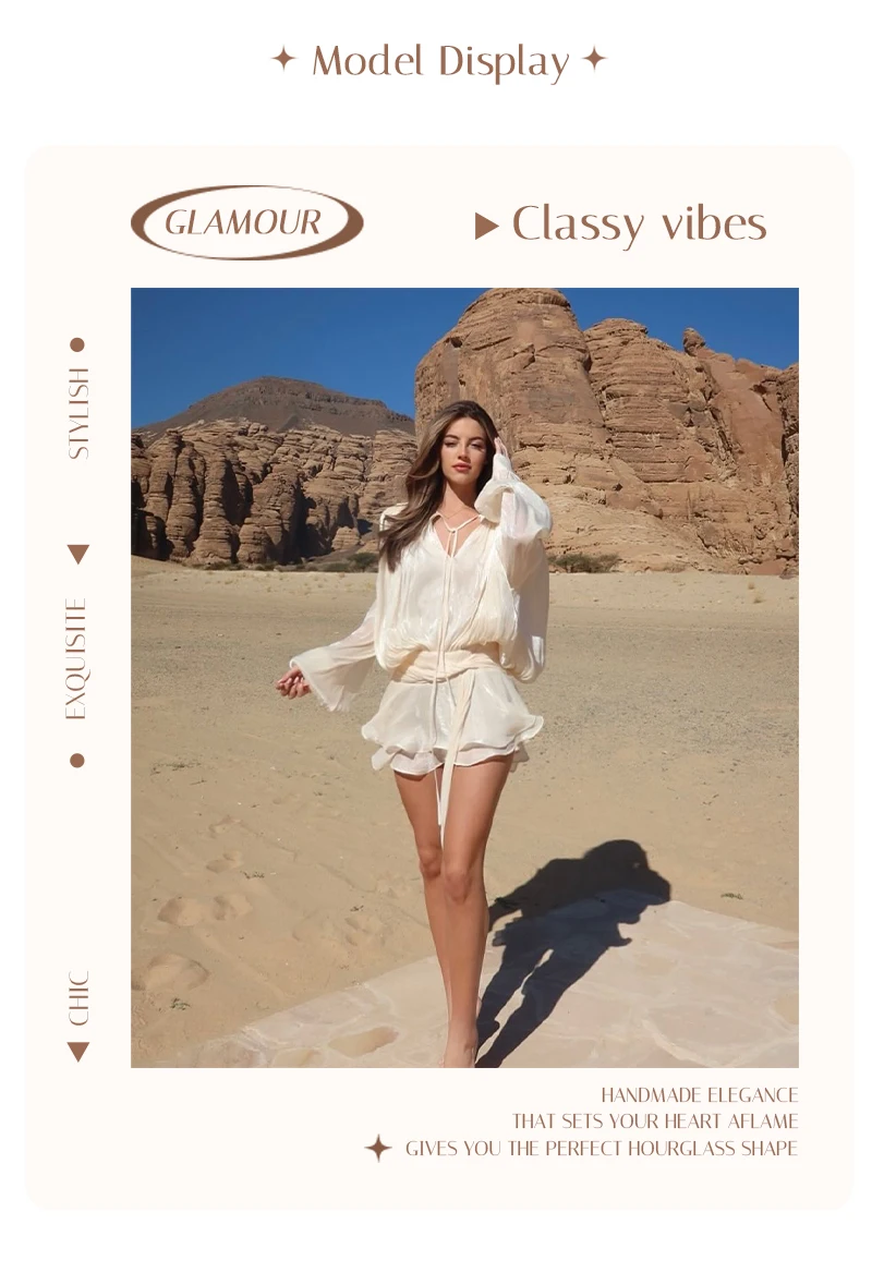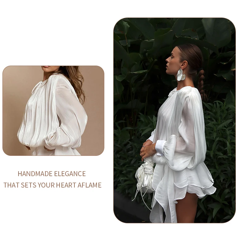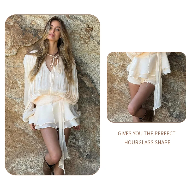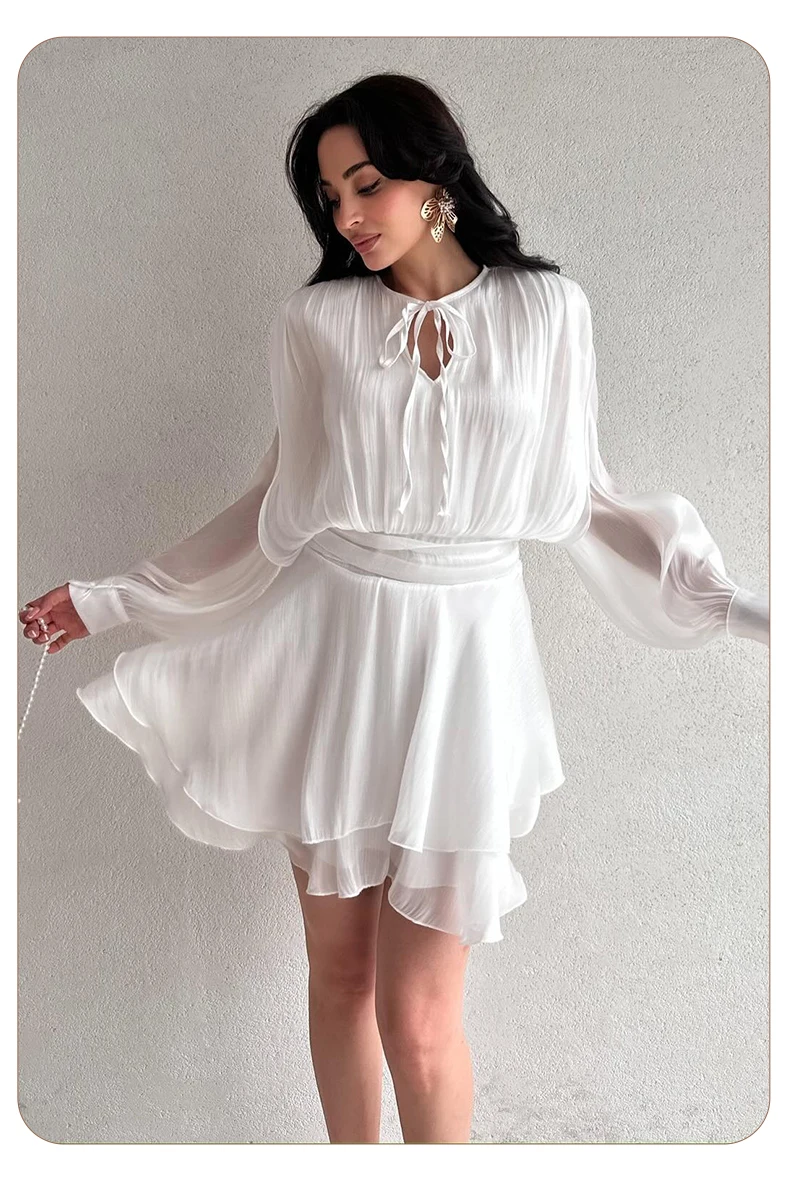 French Style Two-Piece Set White Long Bubble-Sleeve V-Neck Mini Dress with Ruffles Hem Lace-Up Party Dating Holiday Skirt Suit