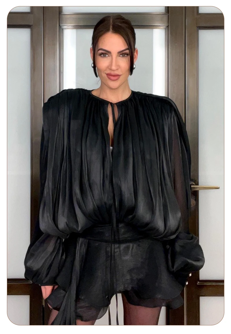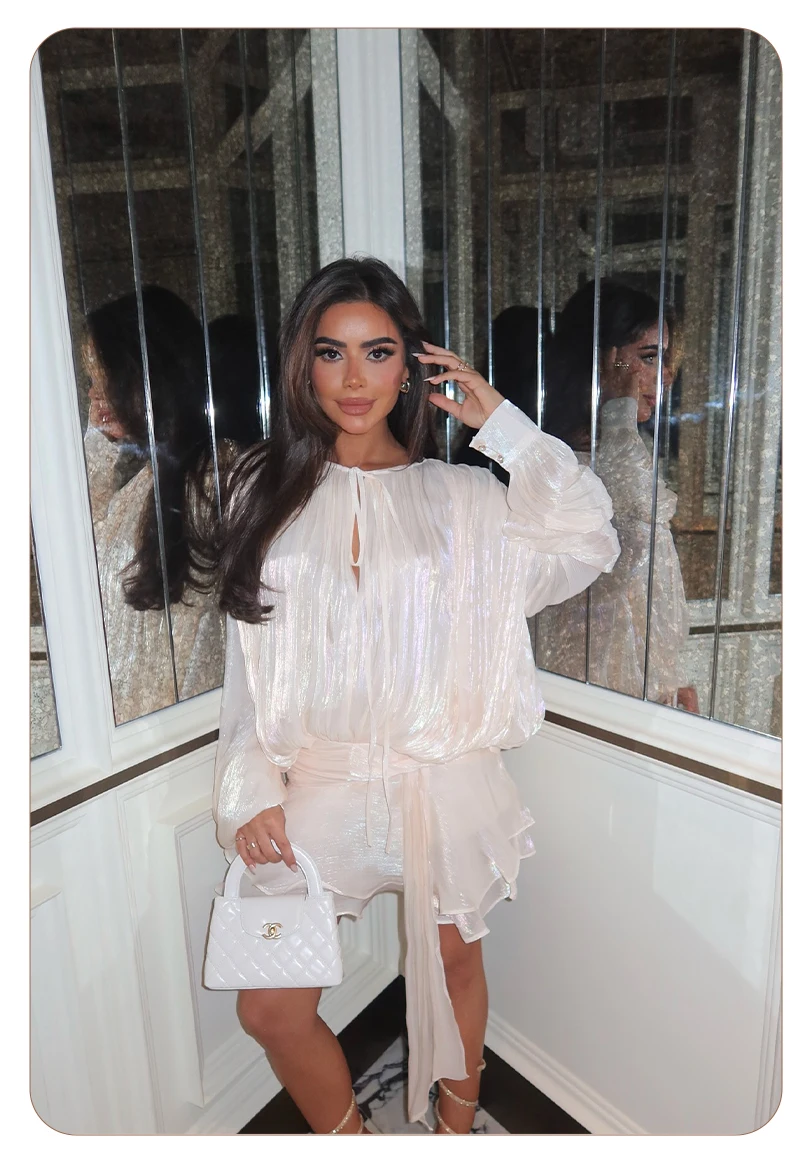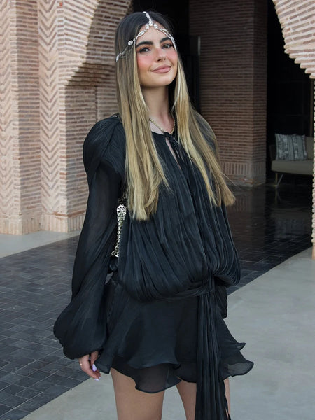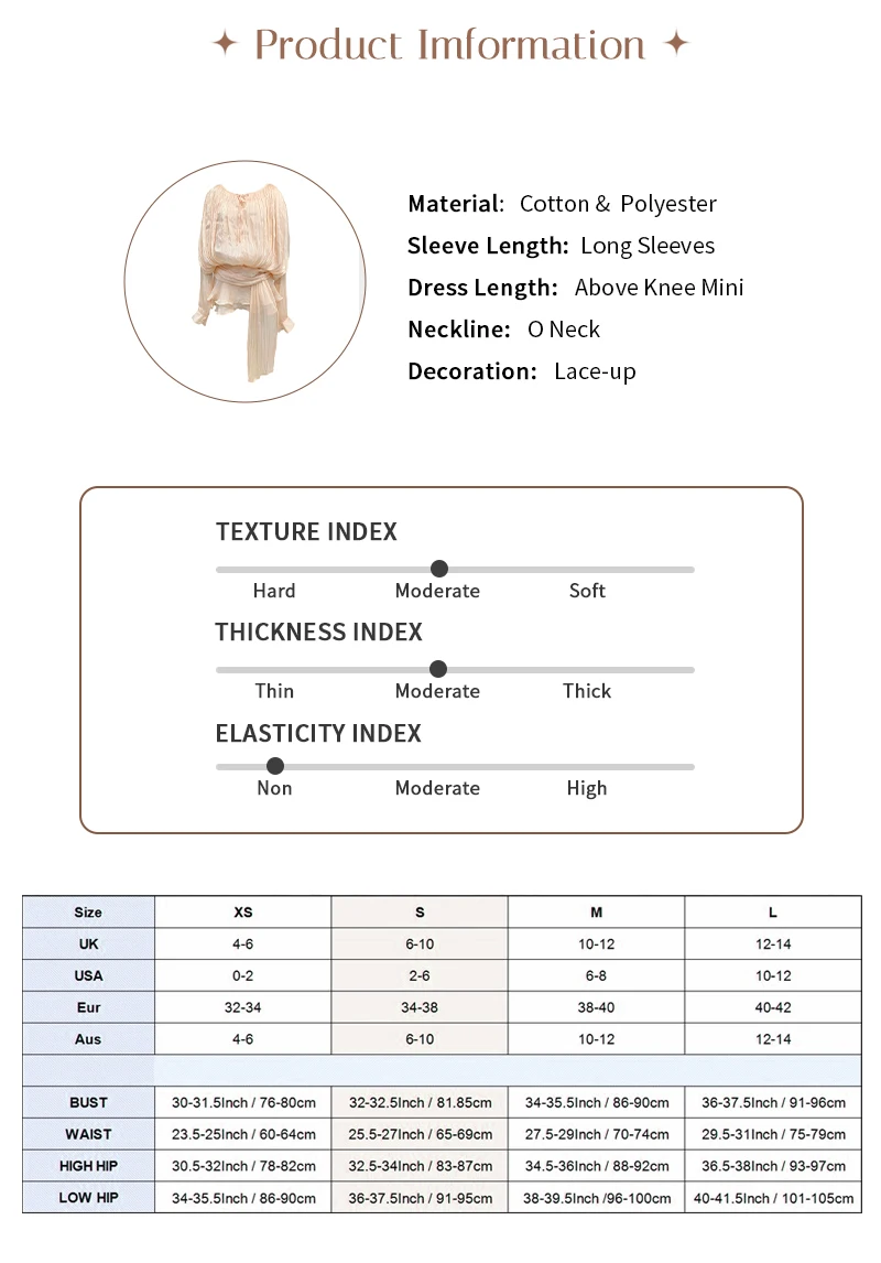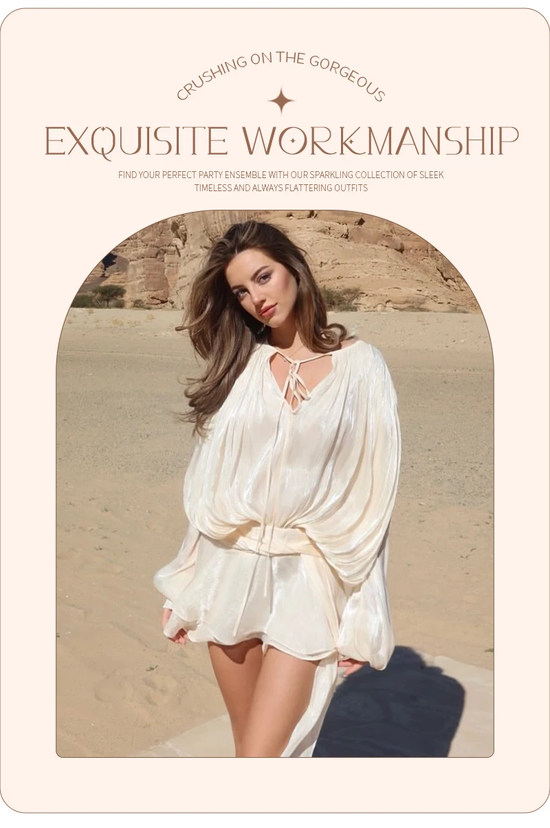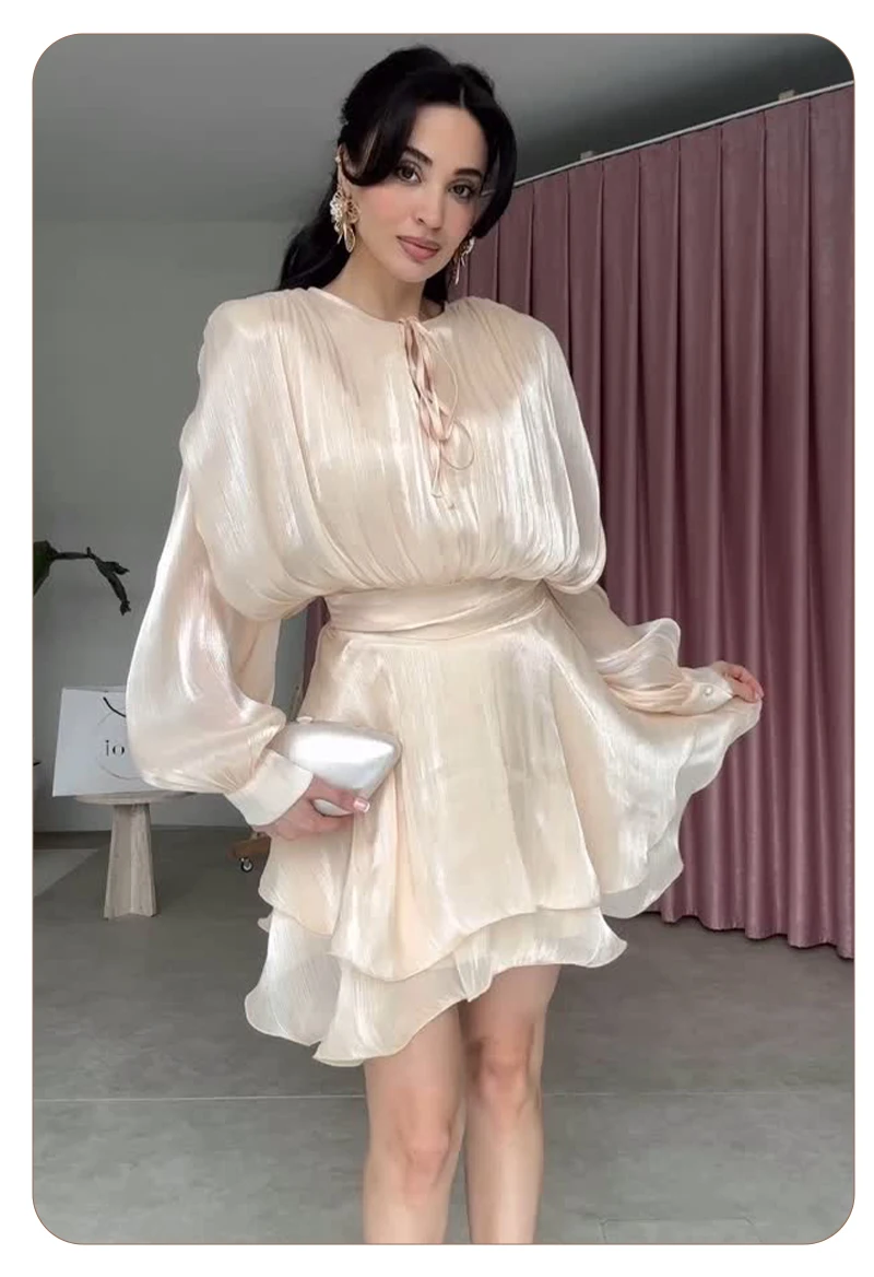 This cream - colored dress exudes sophistication and charm. The long, billowy sleeves and loose - fitting, gathered bodice create a relaxed yet stylish look. The self - tie belt cinches the waist, enhancing the silhouette. The ruffled skirt adds a playful, feminine touch. Ideal for semi - formal events or a stylish daytime outing, it combines comfort with elegant design elements.