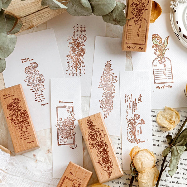 AOOKMIYA Wooden Stamp Ins Literary Retro Line Drawing Lily of The Valley Flower Handbook Diary Diy Printing Decoration Scrapbook Supplies