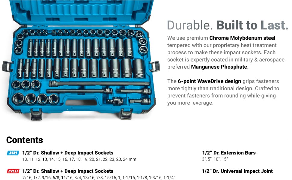 The Capri Tools 1/2 in. Drive Master Impact Socket Set is a complete collection of most frequently used sockets and accessories. Organized by size in a specially made impact-resistant tool case, the impact sockets and accessories stay where they are as you carry them around. We use premium Chrome Molybdenum steel tempered with our proprietary heat treatment process to make these impact sockets and accessories. They are durable and specifically made to withstand high torque from power tools. Each item is expertly coated with manganese phosphate, the preferred coating in military and aerospace, which offers superior protection and corrosion resistance compared to black oxide coating on other impact sockets. The 6-point WaveDrive design grips fasteners more tightly than traditional design, preventing fastener rounding and giving you more leverage. Meets and exceeds ASME B107.110 standards. This master set includes: (29) 1/2 in. drive standard impact sockets: 10, 11, 12, 13, 14, 15, 16, 17, 18, 19, 20, 21, 22, 23, 24 mm, 7/16, 1/2, 9/16, 5/8, 11/16, 3/4, 13/16, 7/8, 15/16, 1, 1-1/16, 1-1/8, 1-3/16, 1-1/4 in.; (29) 1/2 in. drive deep impact socket: 10, 11, 12, 13, 14, 15, 16, 17, 18, 19, 20, 21, 22, 23, 24 mm, 7/16, 1/2, 9/16, 5/8, 11/16, 3/4, 13/16, 7/8, 15/16, 1, 1-1/16, 1-1/8, 1-3/16, 1-1/4 in.; (4) 1/2 in. drive impact extension bars: 3, 5, 10, 15 in.; (1) 1/2 in. drive impact universal joint.