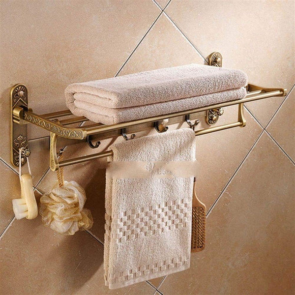 VoOqo Bathroom Towel Holder, Towel Rail Wall Mounted Aluminum Foldable Antique Brass Bath Towel Rack Active Bathroom Towel Holder Double Towel Shelf with Hooks Bathroom Accessories Convenient