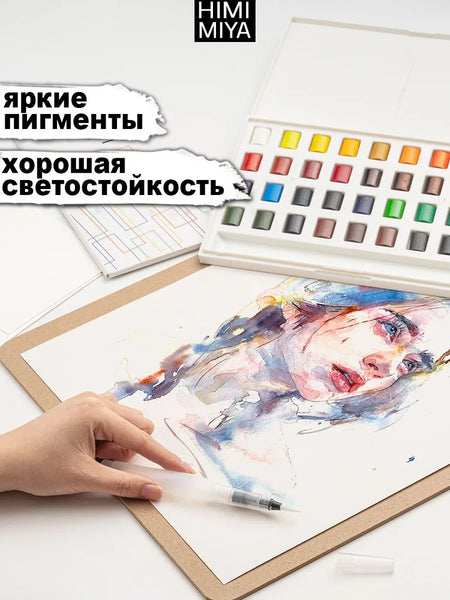 Акварель высокопигментированная, отлично смешивается, замечательно наносится и великолепно ведёт себя на бумаге, а тщательно подобранная цветовая гамма позволит изобразить всё, что захочется!) Краски изготавливаются методом запекания и последующего разрезания брусочков, поэтому они одинакового размера, надежно закреплены в ячейках. Поверьте, этого набора вам хватит надолго, потому что расход краски очень экономный – акварель легко набирается на кисть, а насыщенность можно регулировать добавлением воды.