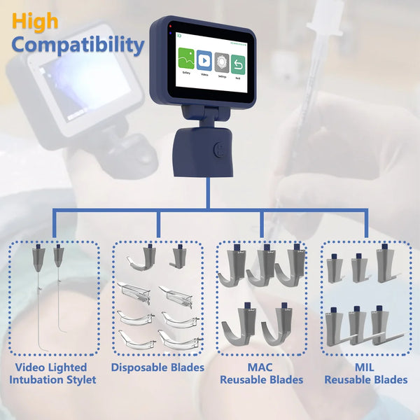 The video laryngoscope set includes a 3.2-inch screen, 6 stainless steel blades, a carrying case, waterproof cap and charger. (Blade models: MIL0, MAC1, MAC2, MAC3, MAC4, D-blade)