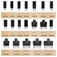 19 Punch sizes: 2x3mm,2x4mm,2x5mm,2x6mm,2x8mm,3x5mm,3x6mm,3x7mm,3x8mm,4x6mm,4x8mm,4x15mm,4x20mm,5x8mm,5x16mm,5x20mm,5x23mm,5x25mm,5x30mm. It’s also equipped with a 3-inch diameter nylon pad, The professional pad can protect the long term use of the punches.