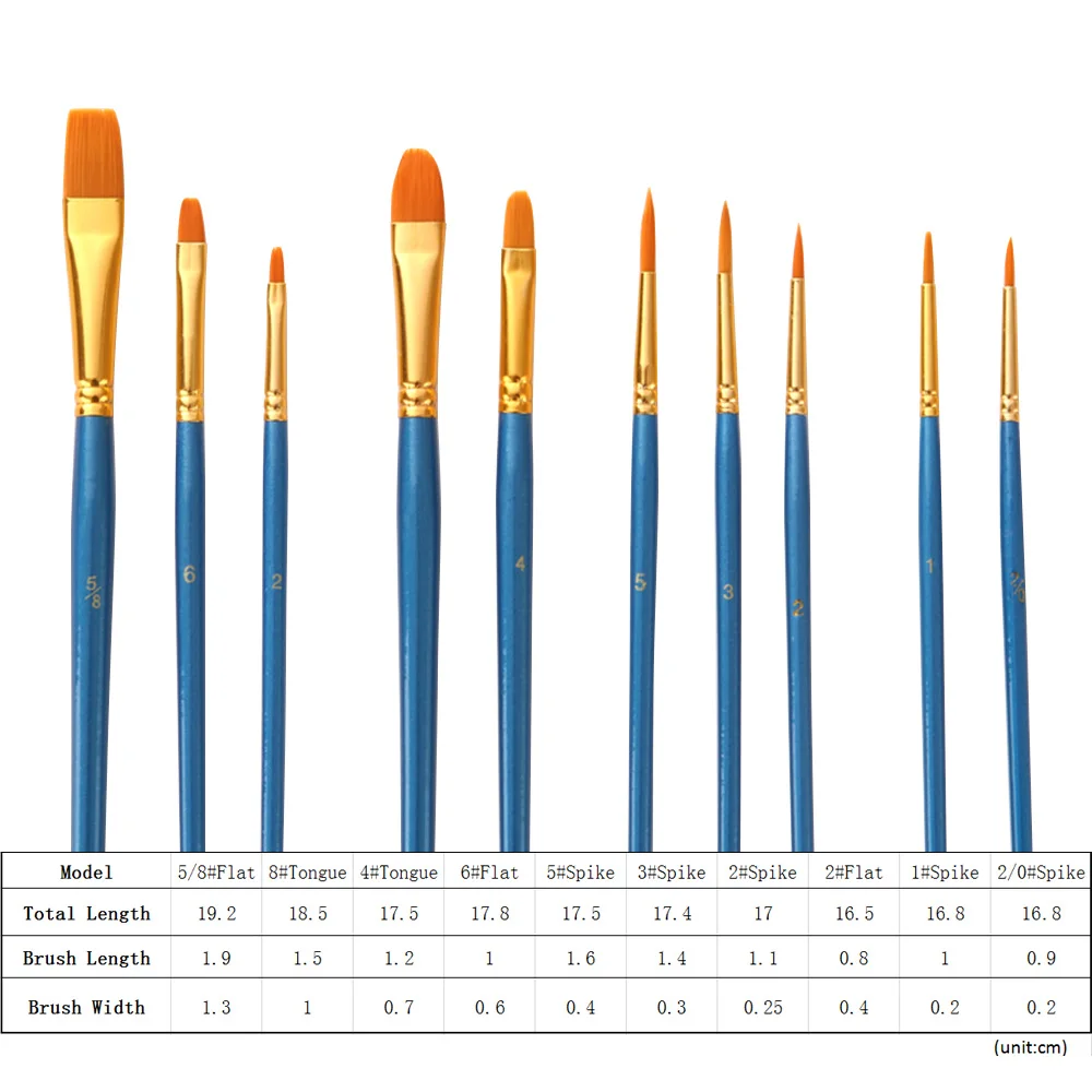 Brush Sizes: #2/0 pinnacle, #1 pinnacle, #2 pinnacle, #3 pinnacle, #5 pinnacle, #2 flat, #6flat, #5/8 flat, #4 tongueshaped, #8 tongueshaped. (5 pcs per size)