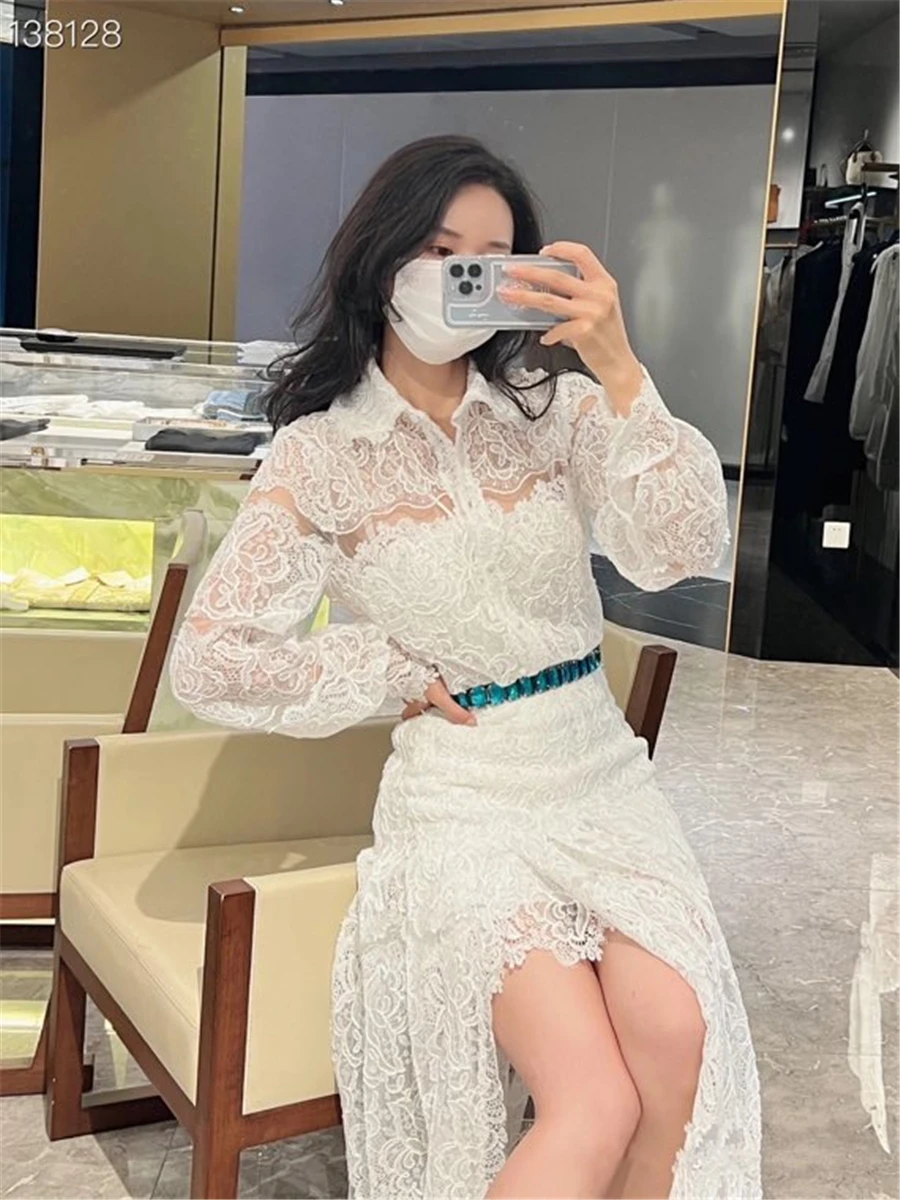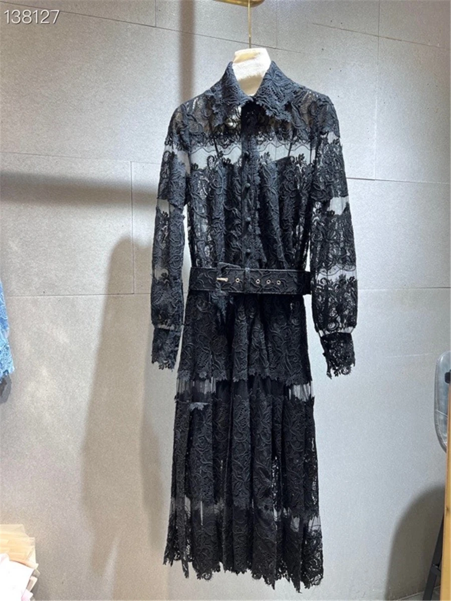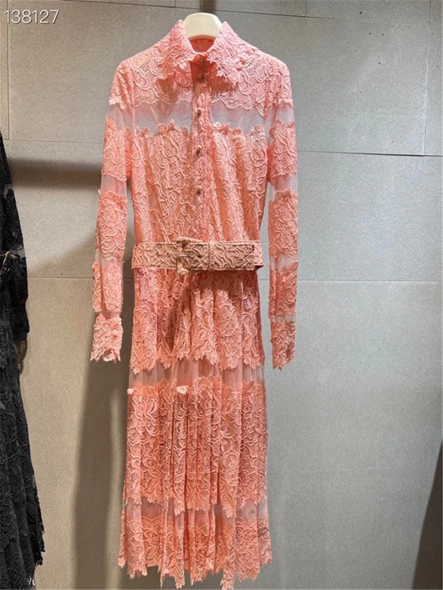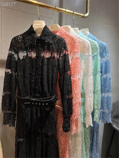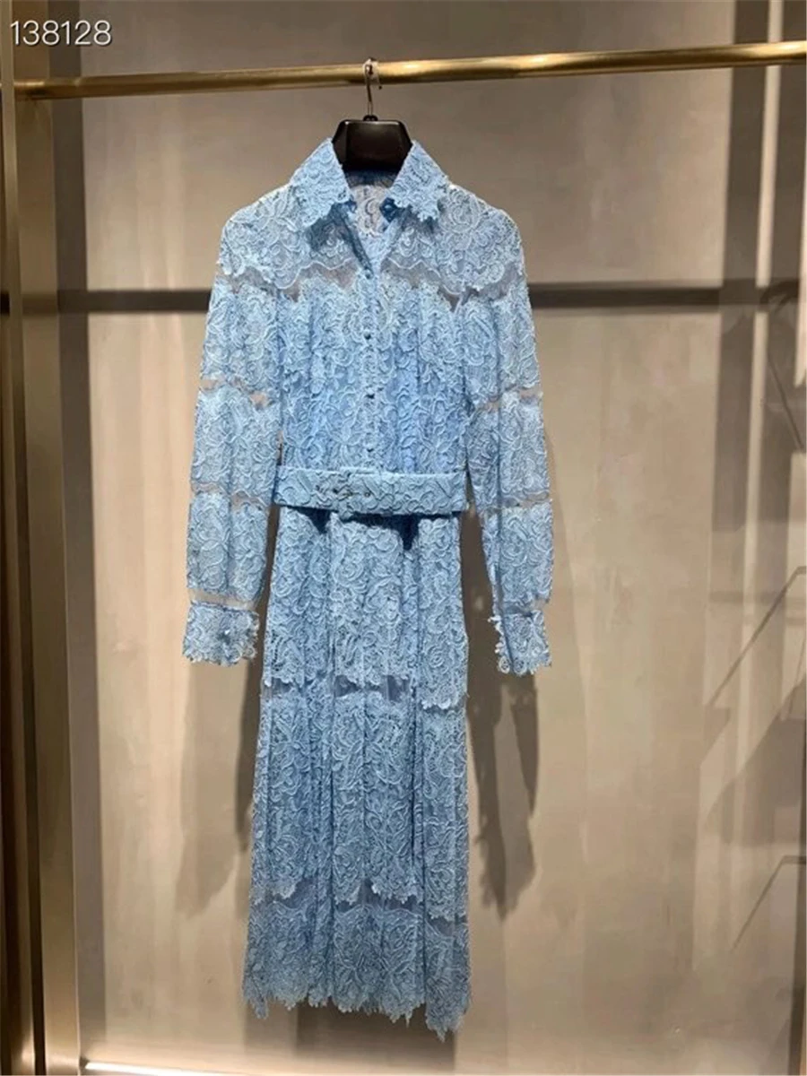 AOOKDRESS Top Quality 2024 New Spring Embroidery Lace Dress Turn Down Collar Hollow Out Fashion Belt Elegant Office Ladies Dress