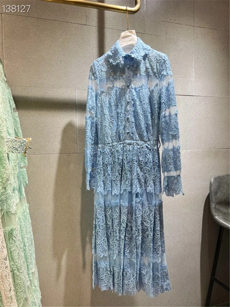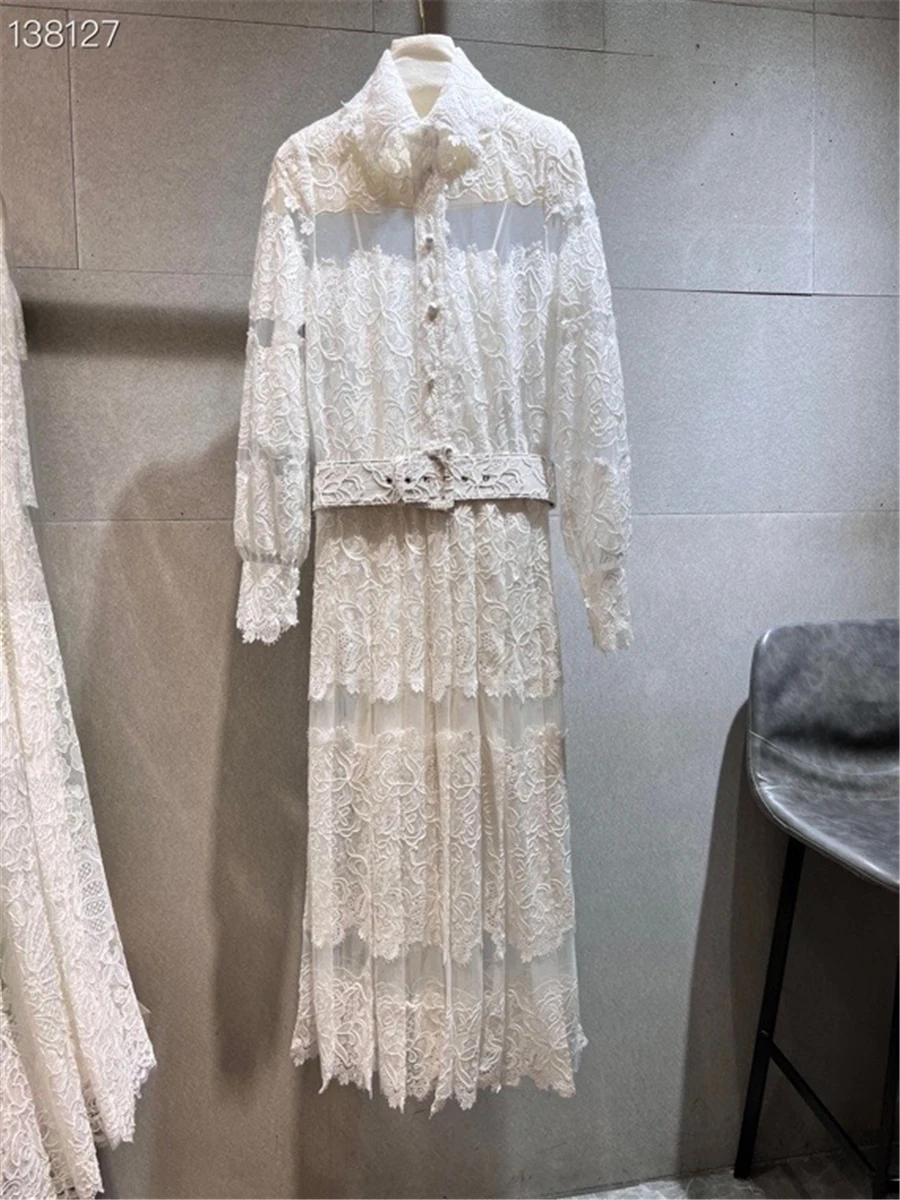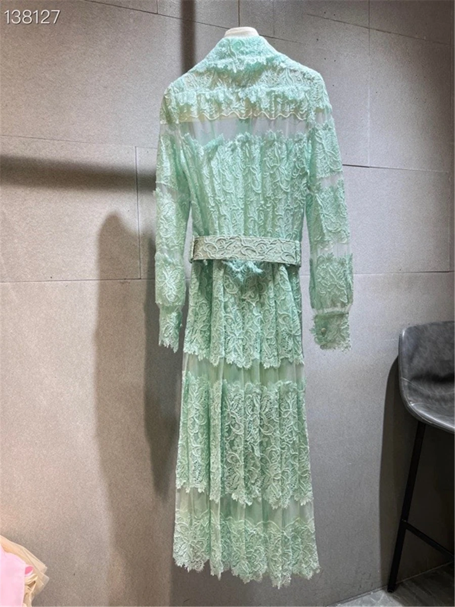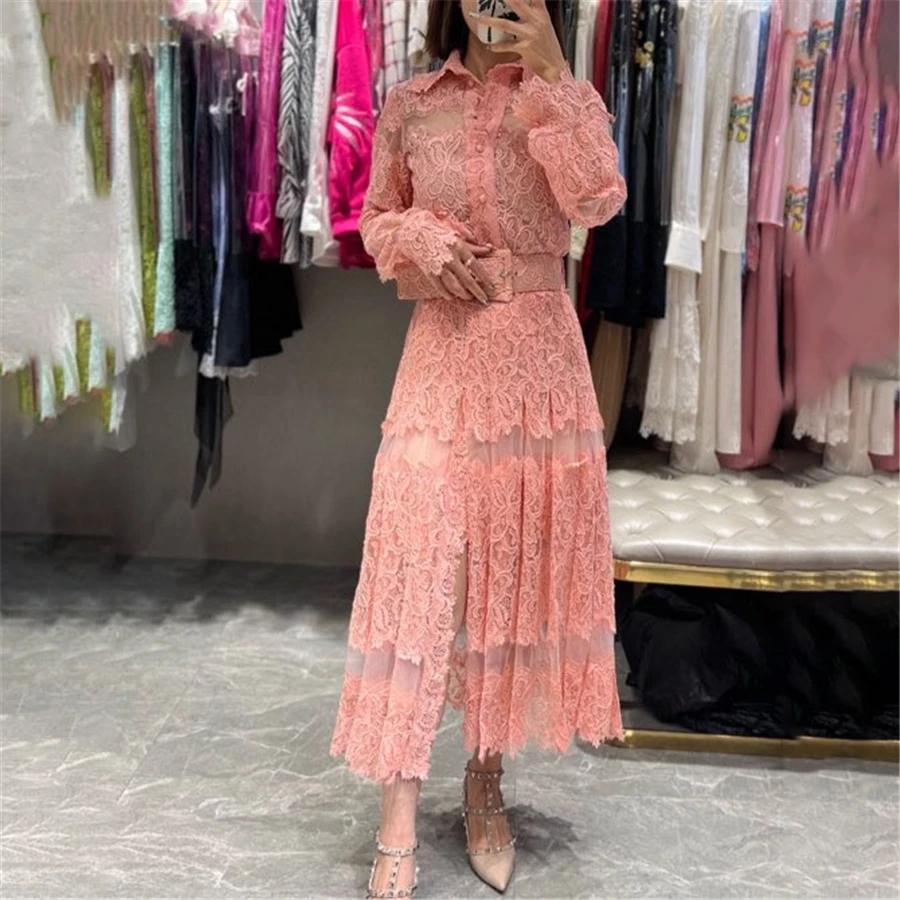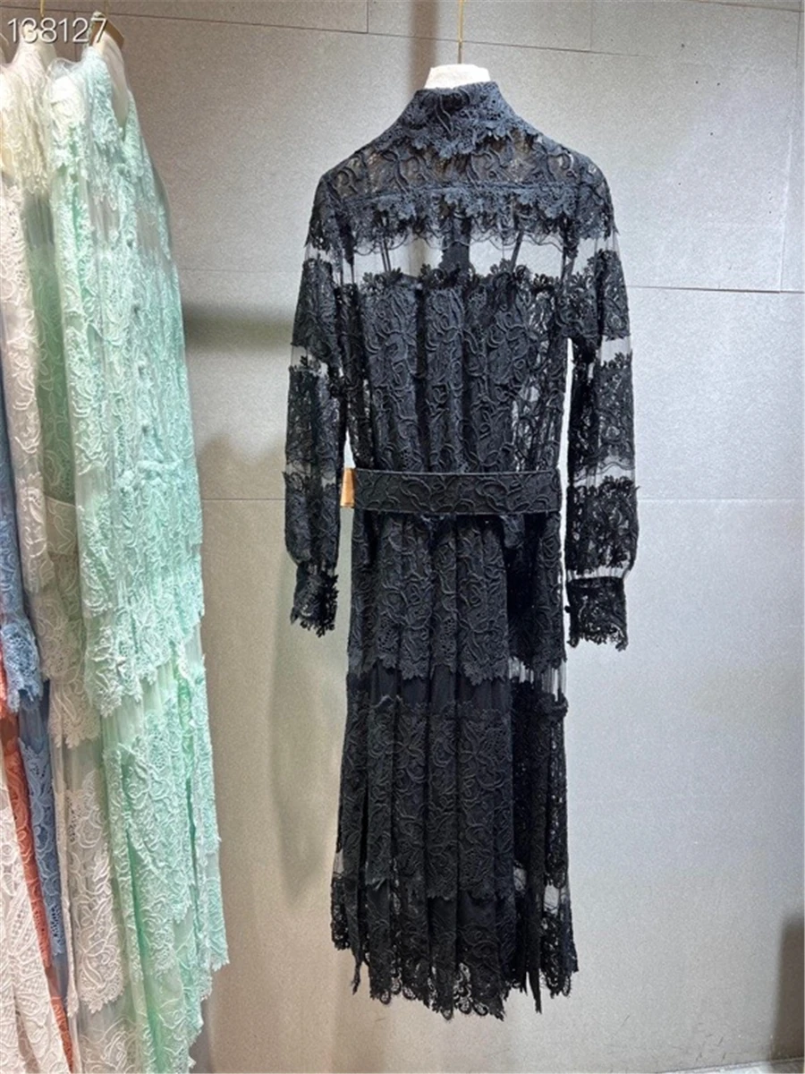 AOOKDRESS Top Quality 2024 New Spring Embroidery Lace Dress Turn Down Collar Hollow Out Fashion Belt Elegant Office Ladies Dress