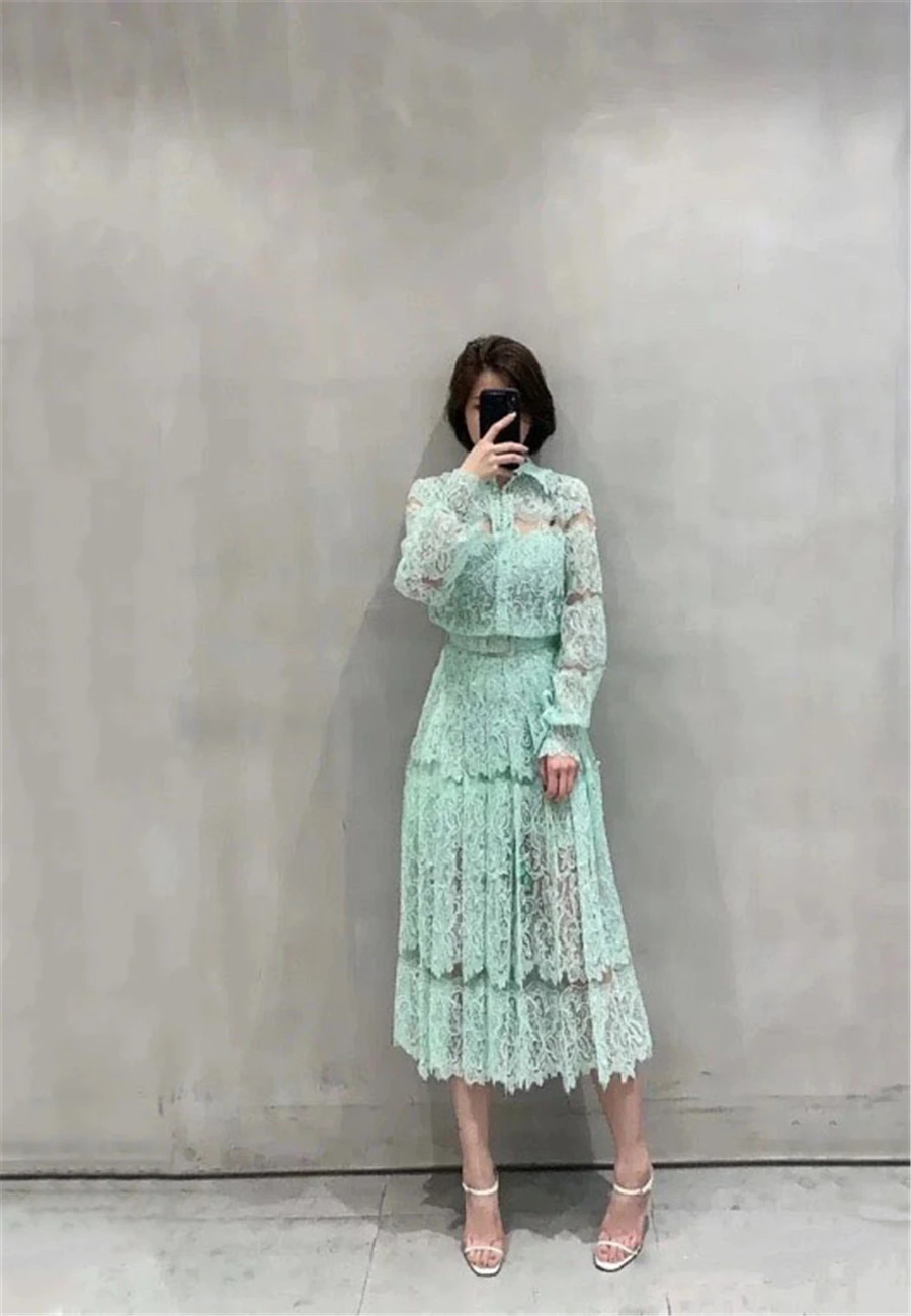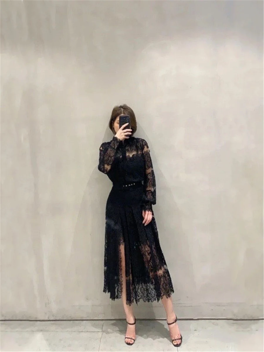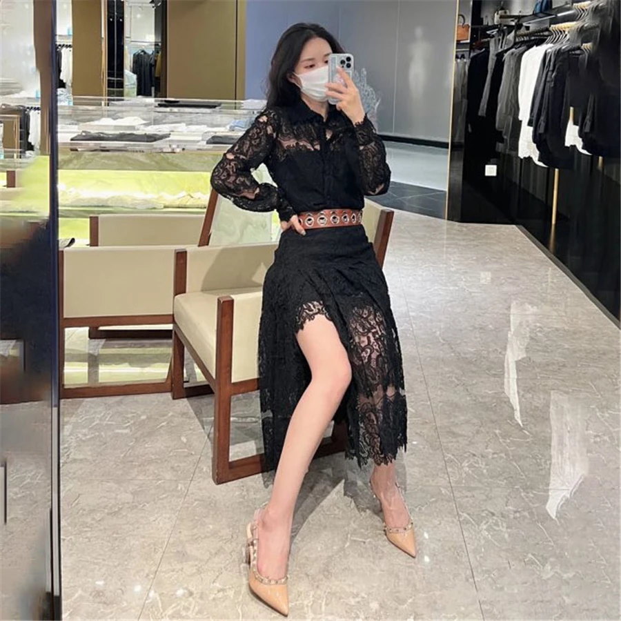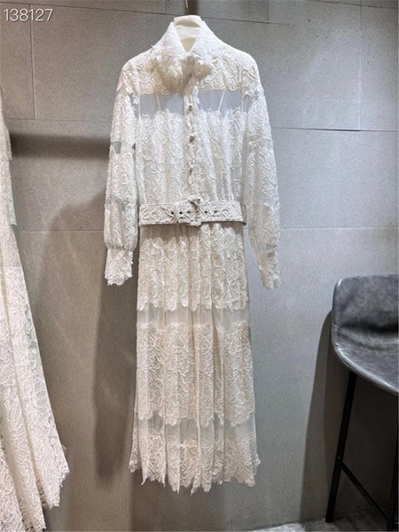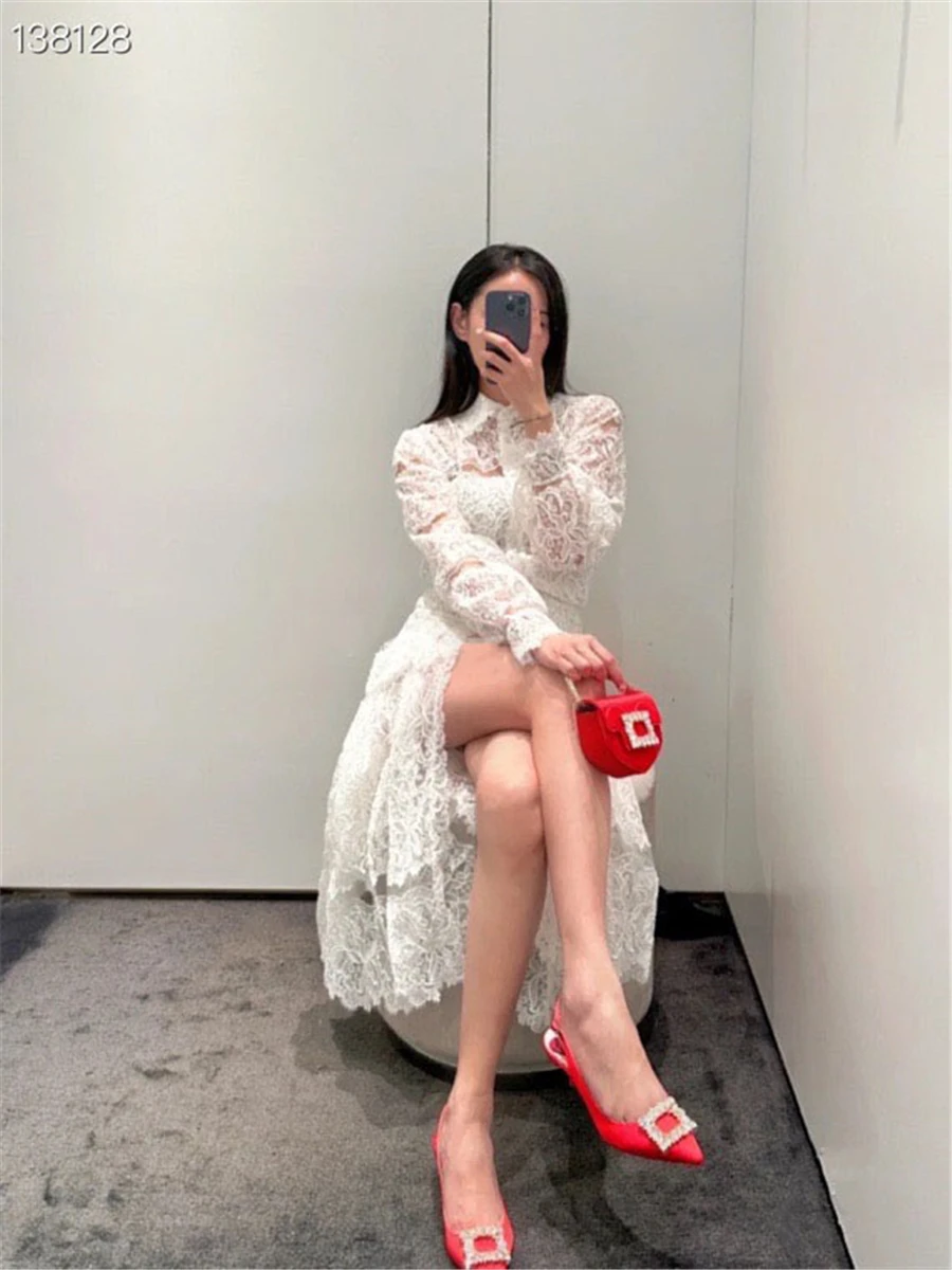 AOOKDRESS Top Quality 2024 New Spring Embroidery Lace Dress Turn Down Collar Hollow Out Fashion Belt Elegant Office Ladies Dress