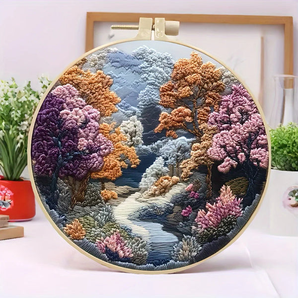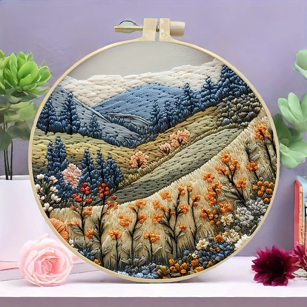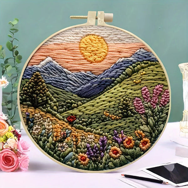 AOOKMIYA Beginners Hand Embroidery Kit - Mountain and Moon Landscape, Mixed Colors, Fabric Included - Perfect Handmade Gift