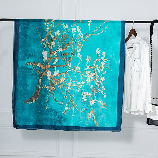 AOOKMIYAVan Gogh Oil Painting Silk Scarf Women Luxury Brand Apricot Floral Print Hijab Bandana Foulard Femme Shawl Soft Bufanda Mujer