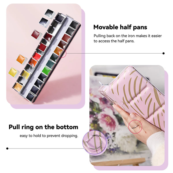 Movable Half Pans: Each watercolor pan can be removed or replaced individually, so you can arrange your colors to your preference. Our lightweight tin is as beautiful as it is functional, and very convenient to carry on the go.