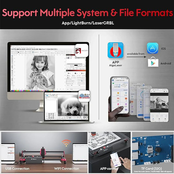 • 【Extensive Compatibility & Uses】 AlgoLaser DIY KIT Laser Engraver can engraving cylinders by add to rotary rollers. Unleash your creativity on over one hundred materials including paper, bamboo, wood, leather PCB board, aluminum oxide, metal, glass, etc.compatible with various mature engraving software, such as LaserGRBL(Free), LightBurn(Paid). Supports Win 7 / Win 8 / XP / Win 10 / Win 11, and also support MacOS and Linux system.