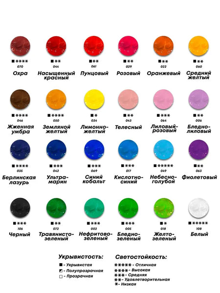 Краски высокопигментированные, отлично смешиваются и позволяют создавать множество новых оттенков. При высыхании гуашь лишь незначительно светлеет, а это значит, что по итогу работы вас не будут поджидать неприятные сюрпризы. Качество гуаши настолько высокое, что подойдет ученикам художественных школ и вузов, художникам-любителям и даже профессионалам!