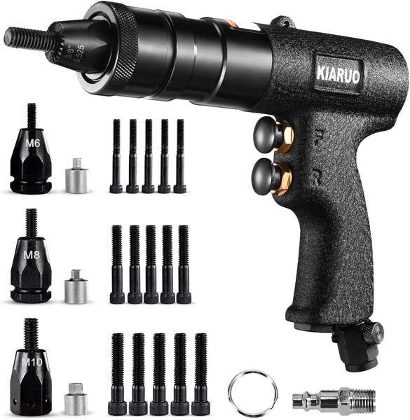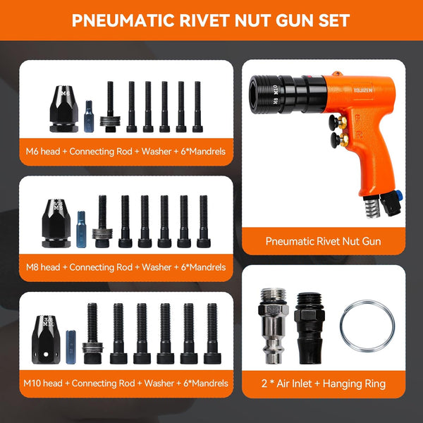 TOJIZEN Metric Pneumatic Rivet Nut Tool Rivet Nut Kit - M6, M8 5/16 & M10 3/8 Inch Gun Heads - Air Powered Rivet Gun Kit For Rivnut, Nutsert, Threaded Insert, Professional Air Riveter And Riv Nut Tool