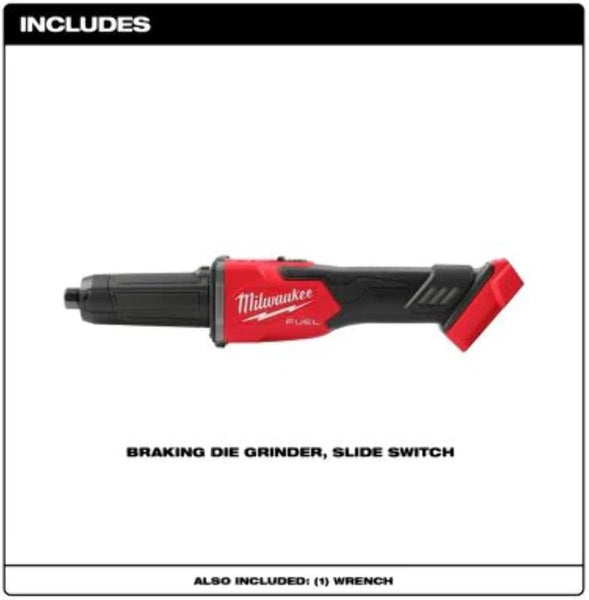 MILWAUKEE M18 FUEL CORDLESS 1/4"" DIE GRINDER (TOOL ONLY) 2939-20 THE WORLD'S FIRST BRUSHLESS DIE GRINDER THAT DELIVERS CORDED PERFORMANCE WITH UP TO 25 MINUTES OF GRINDING AND UP TO 10X LONGER MOTOR LIFE. THE M18 FUEL 1/4 IN. DIE GRINDER DELIVERS MAXIMUM SUSTAINED POWER WITH 20000 RPMS CAPABLE OF RUNNING CARBIDE BURRS OR UP TO 3 IN. FLAP WHEELS FOR GRINDING OR SURFACE PREPARATION APPLICATIONS. THE M18 REDLITHIUM XC5.0 BATTERY PROVIDES UP TO 25 MINUTES OF GRINDING WITH SUPERIOR PACK CONSTRUCTION AND ELECTRONICS. THE POWERSTATE BRUSHLESS MOTOR PROVIDES UP TO 10X LONGER MOTOR LIFE AND LOWER COST OF OWNERSHIP THAN TRADITIONAL BRUSHED MOTORS. THE DIE GRINDER FEATURES REDLINK PLUS INTELLIGENCE THE MOST ADVANCED SYSTEM OF CORDLESS POWER TOOL ELECTRONICS FOR MAXIMUM PERFORMANCE AND LONGEST TOO LIFE. FEATURES UL STYLE""MARGIN-TOP0PX; PADDING-TOP 5PX; PADDING-BOTTOM 5PX;"" MILWAUKEE® POWERSTATE™ BRUSHLESS MOTOR PROVIDES MORE POWER MORE RUN-TIME AND LONGER LIFE THE MILWAUKEE® REDLITHIUM™ BATTERY PACK IS THE MOST DURABLE PACK ON THE MARKET DELIVERING MORE RUN-TIME POWER AND LONGER BATTERY LIFE REDLINK PLUS™ ELECTRONIC INTELLIGENCE ENABLES ADVANCED COMMUNICATION BETWEEN YOUR BATTERIES AND TOOLS ALLOWING FOR UNMATCHED LEVELS OF PERFORMANCE PROTECTION AND PRODUCTIVITY 20000 RPM BRUSHLESS MOTOR IS DESIGNED TO DELIVER CORDED PERFORMANCE WHILE USING CARBIDE BURRS UP TO 3 IN. FLAP WHEELS M18™ REDLITHIUM™ XC5.0 BATTERY PACK (NOT INCLUDED) DELIVERS OVER 20 MINUTES OF GRINDING BRUSHLESS MOTOR HAS NO WEARABLE COMPONENTS DELIVERING UP TO 10X LONGER TOOL LIFE FITS ALL 1/4 IN. SHANK ACCESSORIES CHARGER NOT INCLUDED NUMBER OF BATTERIES REQUIRED 1
