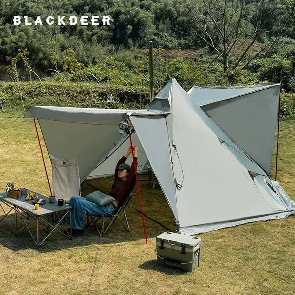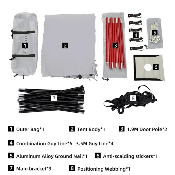 Listing: 1.Outer Bag 2.Tent Body 3.Inner Tent(Need to purchase separately) 4.Tent Pole*5 5.Guy Line *10 6.Aluminum Alloy Ground Nail *22 7.Positioning Webbing 8.Anti-scalding stickers*1
