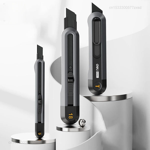 Deli 9mm Safety Knife SK2 Material T Shape Blade ABS Non-slip Handle Art Knife Auto Lock Carbon Steel Sharp Cutting Tools