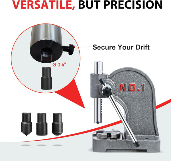 CXRCY cast iron round ram Arbor Press 1Ton comes with three arbor press attachments – a flat drift, pointed drift, and round drift. These features extend its usability, making it a go-to tool for your workshop. It provides a maximum working height of 5.5in/140mm, allowing flexibility and versatility for all your pressing needs. With four fixing holes, you can enjoy a secure and stable operation The Arbor Press stands out with its upgraded round ram, offering a smooth move as well as effortless use and easy operation. This feature makes it ideal for even the most labor-intensive tasks, allowing for professional and precise pressing every time. The arbor press is made from sturdy cast iron material, the press embodies ruggedness and durability, making it perfect for extended use in your workshop. Experience the perfect blend of versatility, quality, and convenience with our 1-Ton Arbor Press. Dive into effortless, high-quality pressing