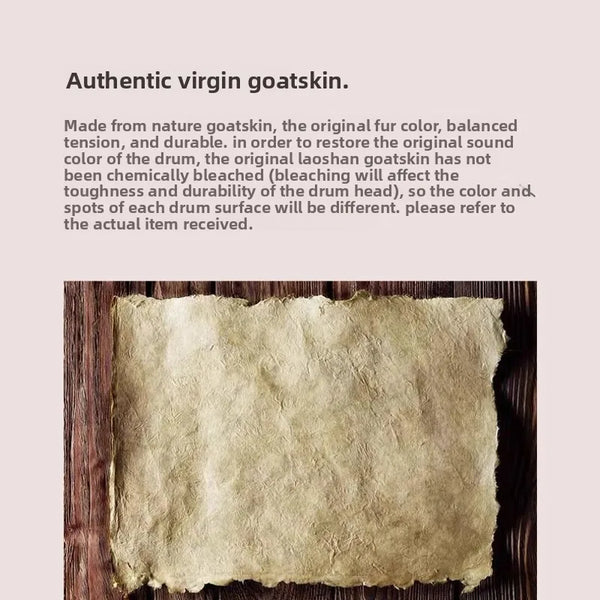 Taken from natural sheepskin, the original ecological fur color, tension balance, durability In order to restore the original sound color of the drum, the original old goat skin has not been chemically bleached (bleaching will affect the toughness and durability of the drum skin), so the color spots of each drum surface will be different, please refer to the actual product received.