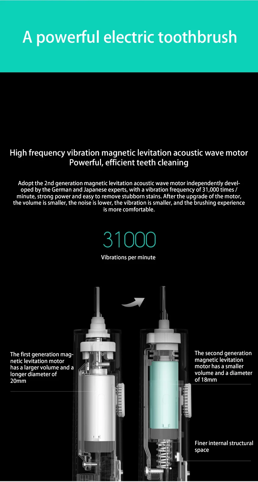 ● 31000 times per minute high frequency vibration, strong teeth cleaning.