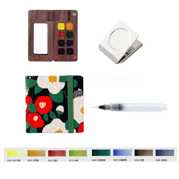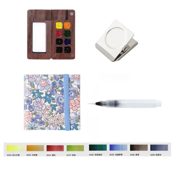 Set B/C/D: watercolor 8 colors + wooden box + Magnetic clip + watercolor book (6*6cm) + absorbent brush