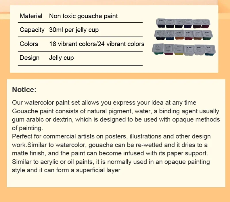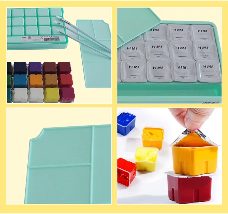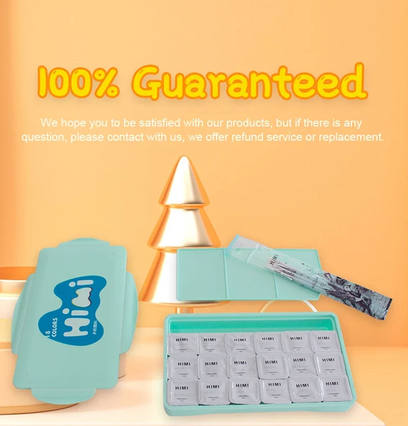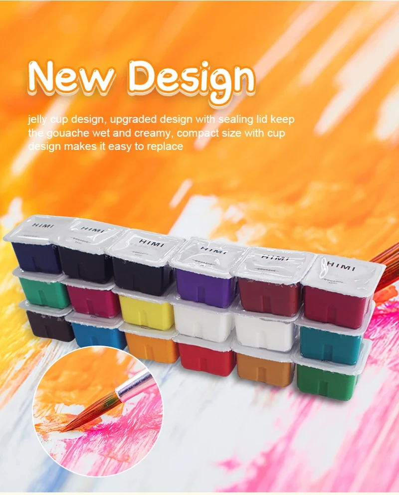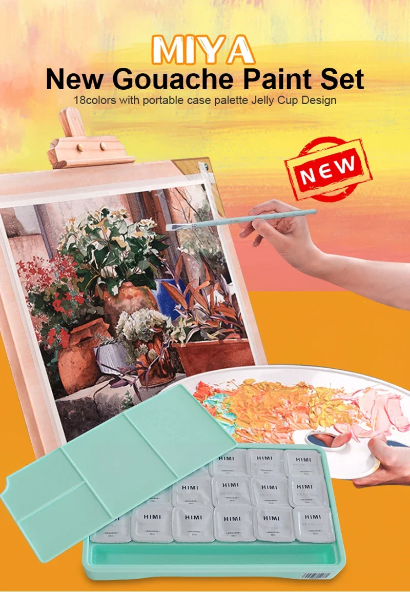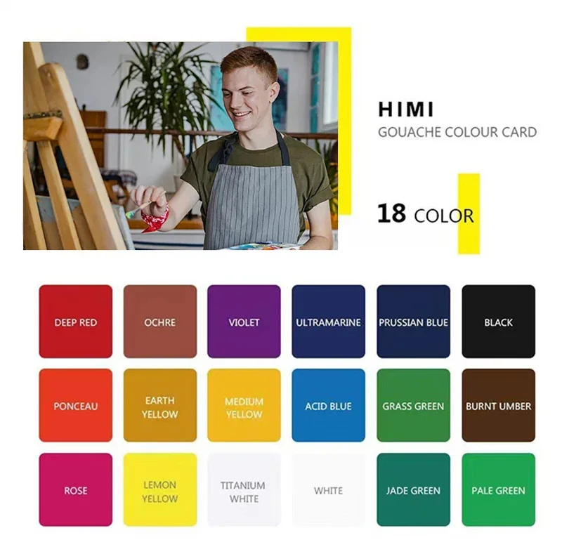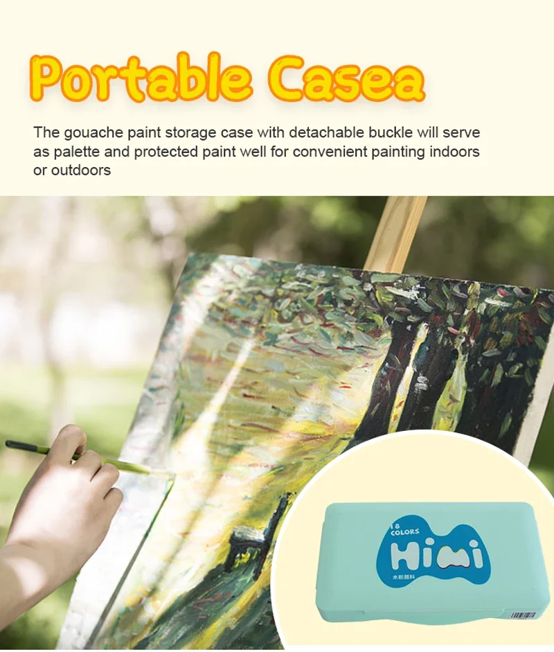 HIMI Guache Paint Set:18/24 cores vibrantes com uma paleta de estojo portátil, três pincéis de alta qualidade e ideias para tela, madeira, tecido, gesso, pedra e unhas.