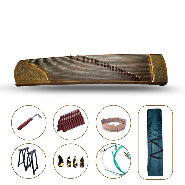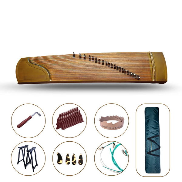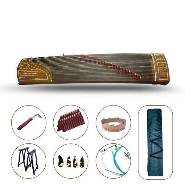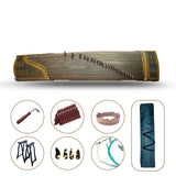 1 nanmu guzheng,1 sets of professional guzheng nails, 1 set of #1-5 spare strings, a set of sandalwood bridges, a pair of A style guzheng stands, a set of standard guzheng strings (fixed), a tuning hammer, a guzheng big bag.