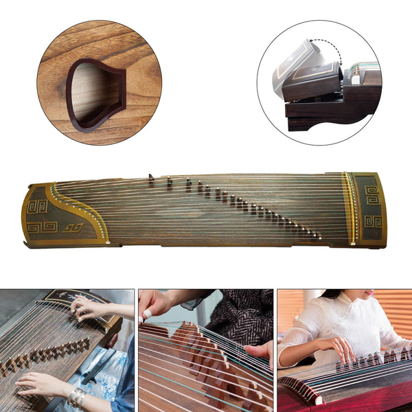 This guzheng adopts nanmu, paulownia wood, pine wood and solid wood as the main material. All the material used were of good quality and were soaked, slag removed and dried before using, which directly contribute to the smooth touch feeling and good sound of the guzheng. The carved pictures were handcrafted by professional cutlers with precise workmanship, making the guzheng exquisite and elegant as well as giving the guzheng culture connotation. The strings were covered by nylon to make the sound rich, mellow and vibrant.