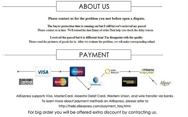 1. There are many payment methods available on Aliexpress such as Alipay, credit cards,real-time bank transfers, offline payments (bank transfers and Western Union).You can choose a method which is the most convenient for you. To protect your interests,your payment will be temporarily held by Alibaba, and will not be released to us until you receive your order and are satisfied with it.