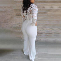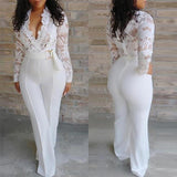 White Jumpsuit Women Lace Stitching Long Sleeve V-neck Plus Size Wide Leg Long Pants Office Lady Jumpsuits for Women Lugentolo